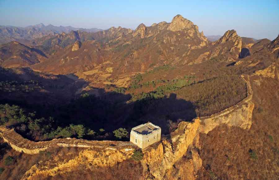 Aerial photo taken on April 15, 2018 shows the ancient Great Wall in Suizhong County, Huludao, northeast China's Liaoning Province. (Xinhua/Yang Qing)
