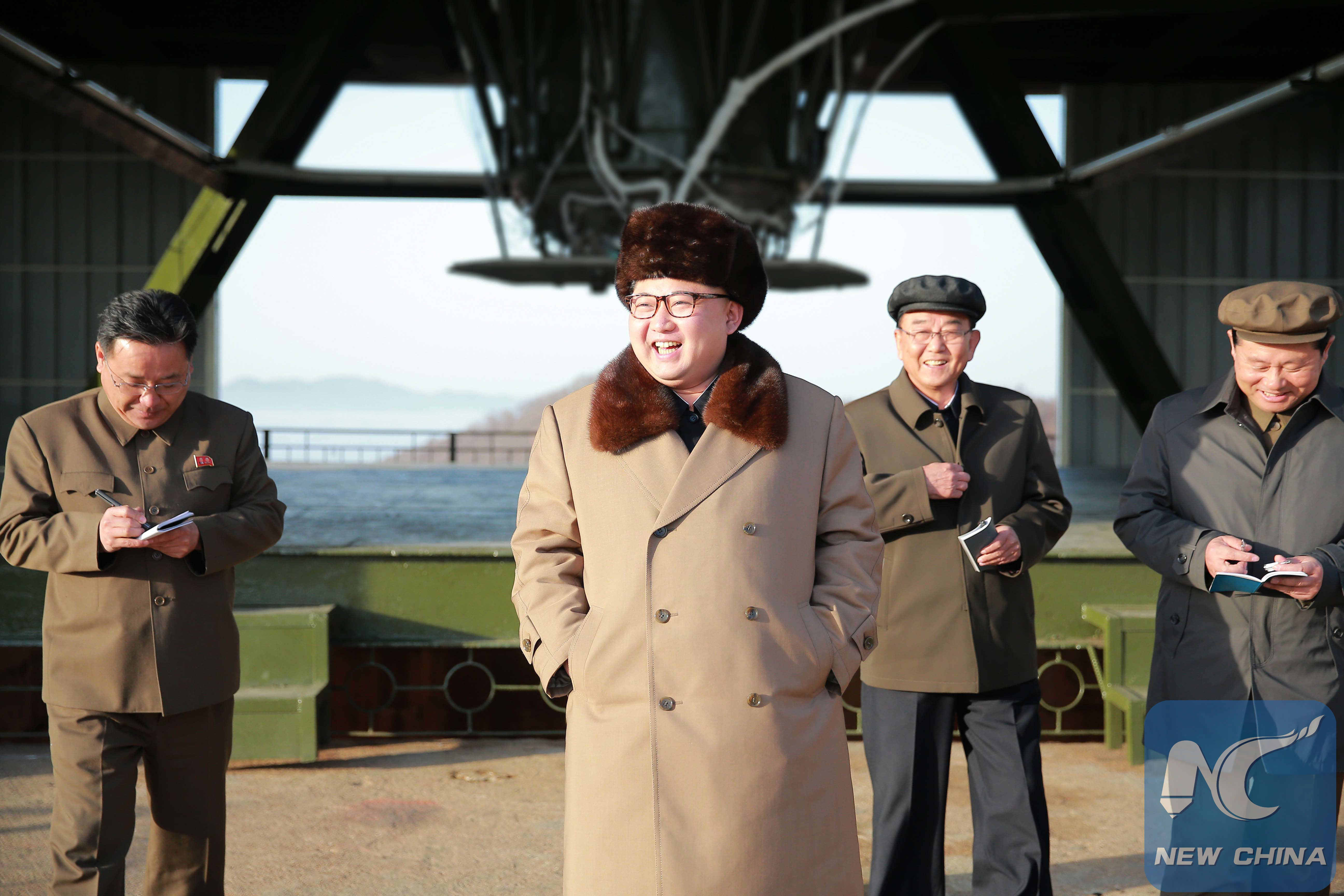 Photo provided by Korean Central News Agency (KCNA) on April 9, 2016 shows top leader of the Democratic People's Republic of Korea (DPRK) Kim Jong Un (front) recently overseeing the successful ground test of a heavy-lift engine of a new-type intercontinental ballistic rocket. (Xinhua/KCNA)
