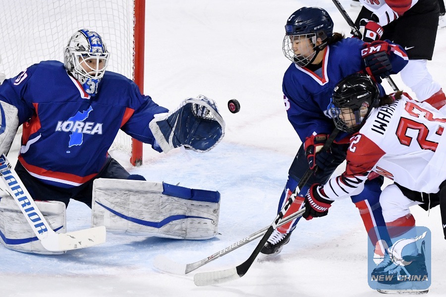Iwahara Tomomi (1st R) of Japan shoots against the unified team of the DPRK and South Korea during the preliminary match of women's ice hockey at the Pyeongchang 2018 Winter Olympic Games at the Kwandong Hockey Centre in Gangneung, South Korea, on Feb. 14, 2018.(Xinhua/Ju Huanzong)