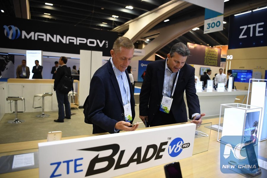 People visit the booth of Chinese telecommunication firm ZTE Corporation during the 2017 Mobile World Congress Americas (MWCA) in San Francisco, the United States on Sept. 12, 2017. (Xinhua/Wu Xiaoling)