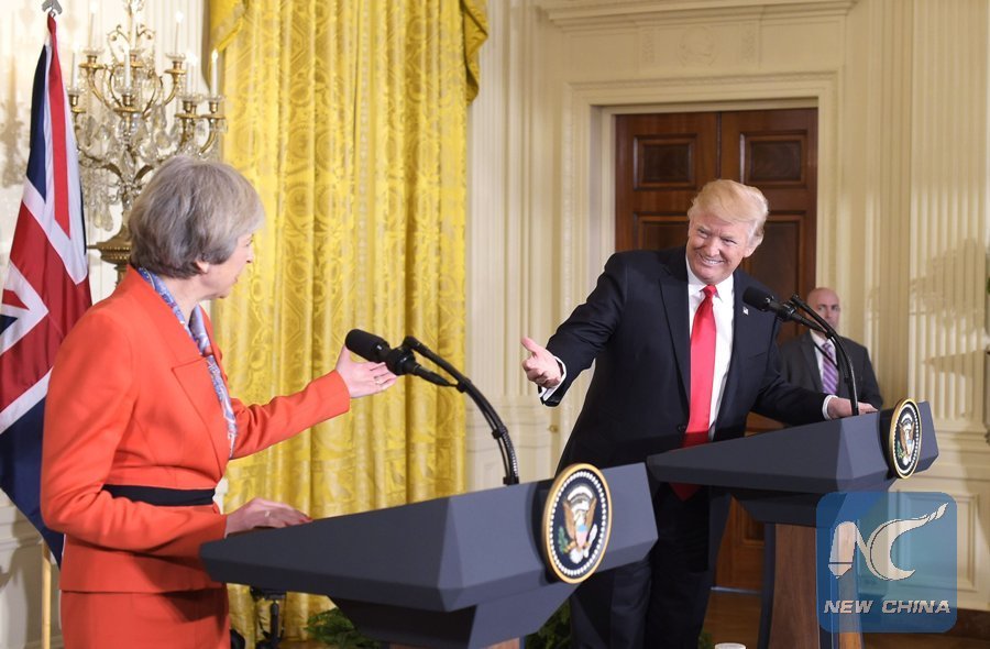 Britain's Prime Minister Teresa May gestures at a joint press conference with US President Donald Trump in the East Room of the White House on January 27, 2017 in Washington, D.C. (Xinhua/AFP)