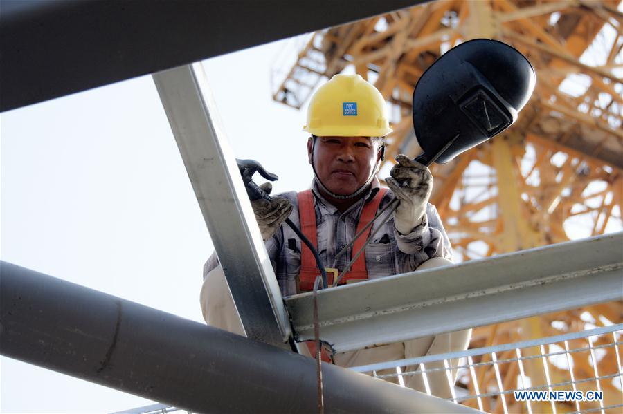 Worker Zhu Chuanming conducts gas welding work at a skyscraper construction site in Beijing, capital of China, May 1, 2018. Many Chinese workers stick to their posts on the 2018 International Workers' Day as the country enjoys the three-day holiday. (Xinhua/Jin Liangkuai)