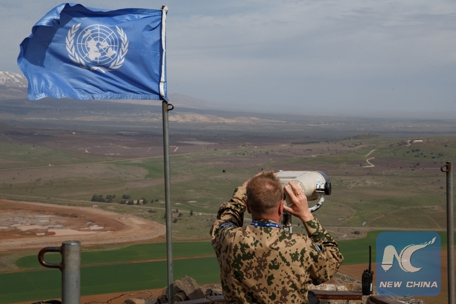 File Photo: A member of the United Nations Disengagement Observer Force (UNDOF) looks through binoculars from Mount Bental, an observation post in the Israeli occupied Golan Heights near the ceasefire line between Israeland Syria, on Feb. 10, 2018. The Israeli army launched a large-scale attack against the Syrian aerial defense system and Iranian targets in Syria after an Israeli F-16 fighter was hit by missiles from Syria and crashed. (Xinhua/JINI)