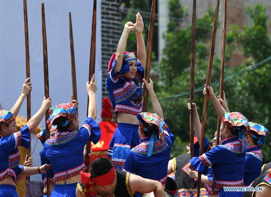 Troupers perform during a celebration of Weifeng Festival in Luwei Township of Binyang County, south China's Guangxi Zhuang Autonomous Region, May 22, 2018. Local people of the Zhuang ethnic group celebrate the festival on the eighth day of the fourth month in Chinese lunar calendar. (Xinhua/Lu Bo'an)??