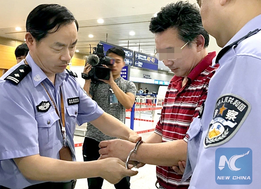 File Photo: Suspect surnamed Du is handcuffed at Pudong International Airport in Shanghai, east China, June 20, 2017. A suspect has been returned from Canada to China as part of a campaign to capture economic fugitives, Chinese police said. The suspect, surnamed Du, fled in December 2012 with more than 4 million yuan (over 588,000 U.S. dollars) that he allegedly obtained from others in the name of investment. (Xinhua/Fan Jun)