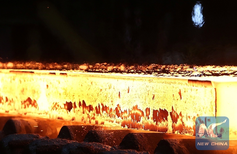 A slab of steel rolls down the line at the NovolipetskSteel PAO steel mill in Farrell, Pennsylvania, U.S., March 9, 2018. (Xinhua/REUTERS)