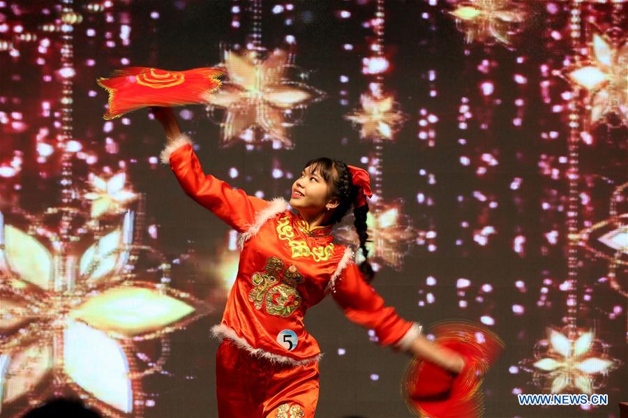 A student performs dancing during the "Chinese Bridge" Chinese Proficiency Competition for Foreign Students at the China Cultural Centre in Yangon, Myanmar, June 3, 2018. (Xinhua/U Aung)