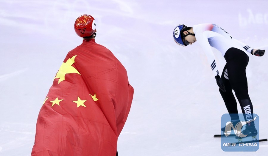 File Photo: Wu Dajing (L) of China celebrates victory after men's 500m final of short track speed skating at the 2018 PyeongChang Winter Olympic Games at Gangneung Ice Arena, Gangneung, South Korea, Feb. 22, 2018. Wu Dajing claimed gold medal in a time of 0:39.584 and set new world record. (Xinhua/Lan Hongguang)