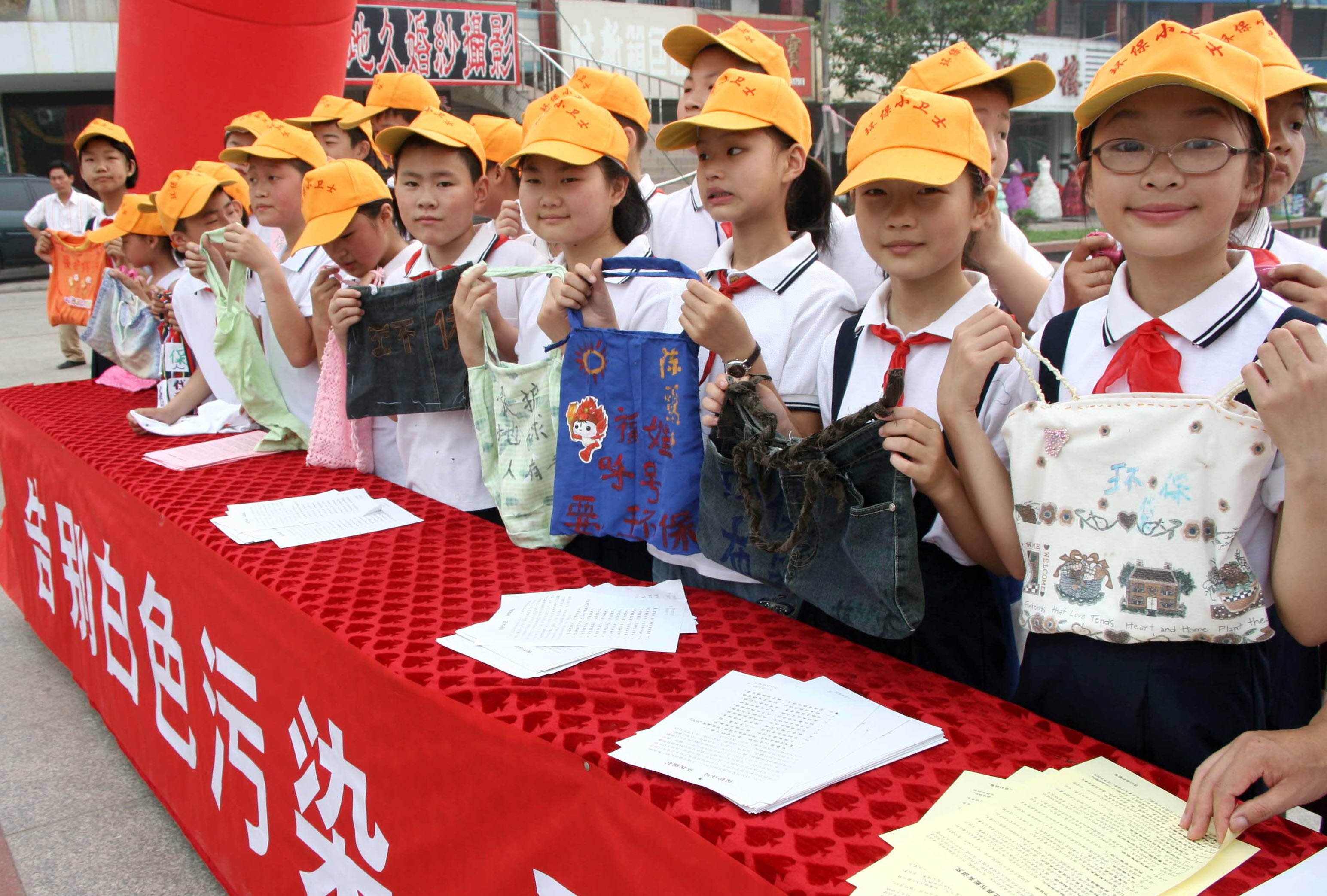 File photo taken on June 1, 2008 shows pupils displaying hand-made shopping bags in Hanshan, a county of east China's Anhui Province. (Xinhua/Cheng Qianjun)