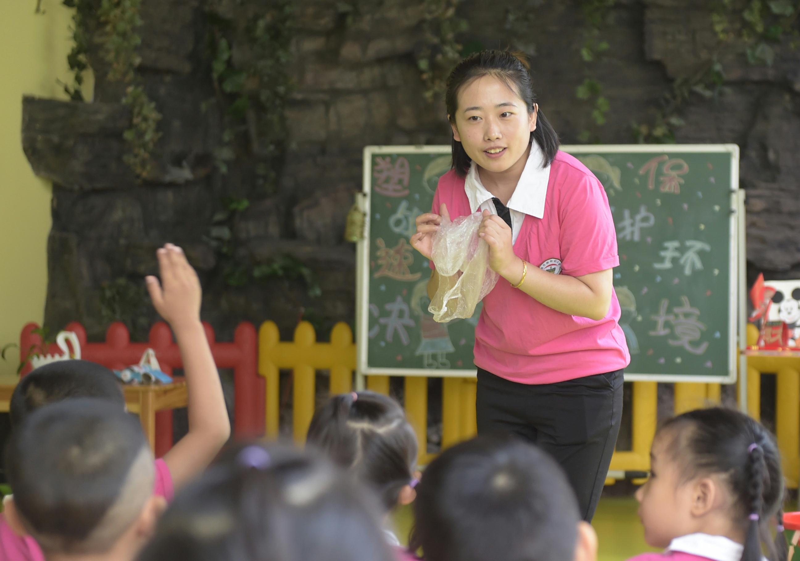 A teacher introduces the effect of plastic garbage on the environment at a kindergarten in Langfang City, north China's Hebei Province, June 5, 2018, the World Environment Day. (Xinhua/Lu Peng)