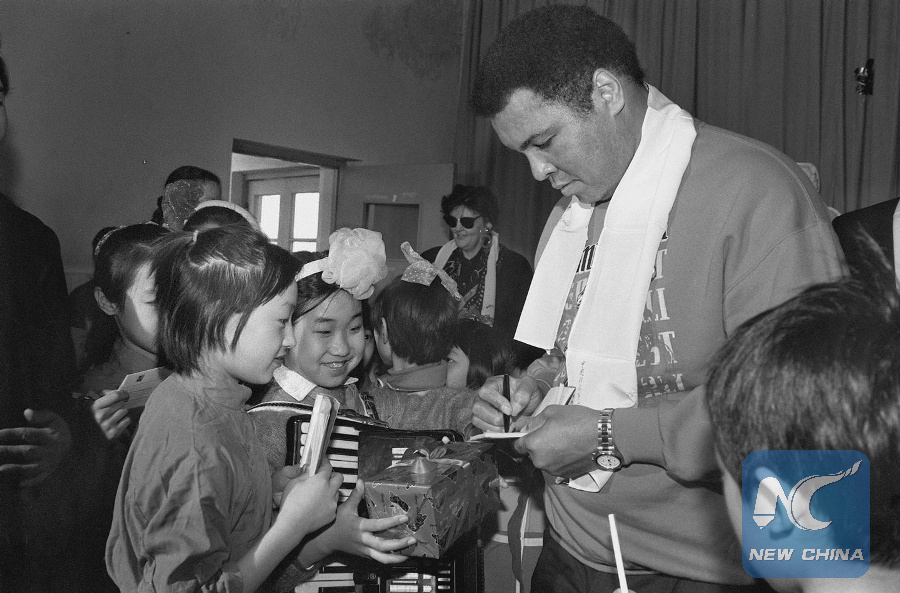 Former world boxing champion Muhammad Ali signs for the pupils in the 1st Experimental Elementary School of Beijing on Feb. 25, 1993 when he is invited as a guest for the Beijing International Boxing Champions Meet. (Xinhua/Guan Tianyi)