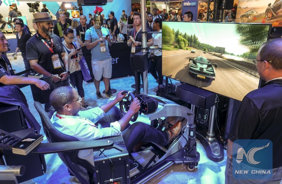 Gamers experience new games at the Electronic Entertainment Expo 2018 (E3 2018) held in Los Angeles, the United States, on June 12, 2018. (Xinhua/Zhao Hanrong)