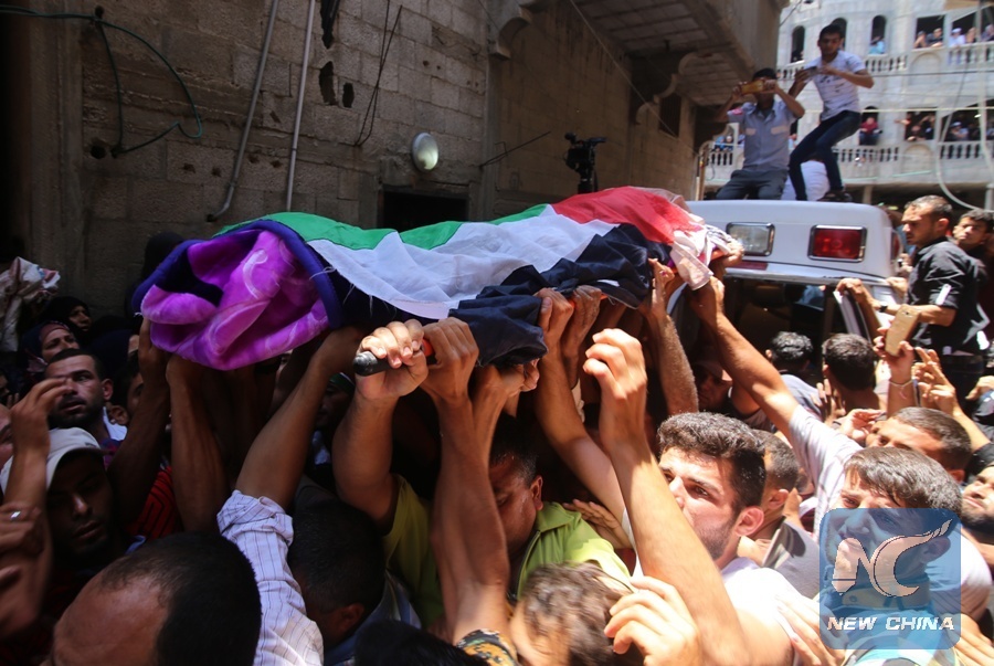 Mourners carry the body of Razan al-Najjar during her funeral in the southern Gaza Strip City of Khan Yunis, on June 2, 2018. (Xinhua/Khaled Omar)