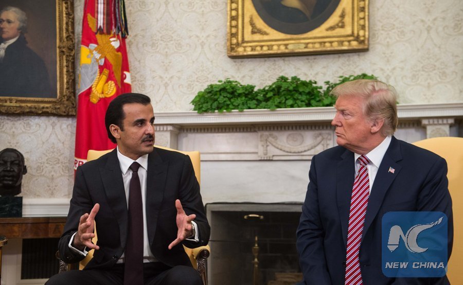 Qatari Emir Sheikh Tamim bin Hamad al Thani speaks to the press with U.S. President Donald Trump in the Oval Office at the White House in Washington, D.C., on April 10, 2018. (Xinhua/AFP)
