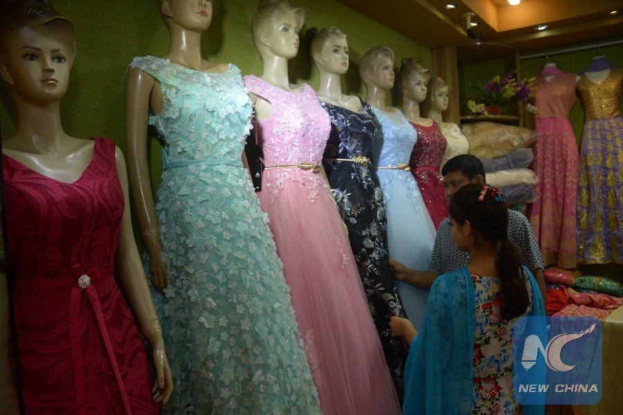 A girl choosing Chinese long gown in a store in Bashundhara City, a shopping mall in Bangladesh capital Dhaka's commercial Karwan Bazar area, on June 5, 2018. (Xinhua)