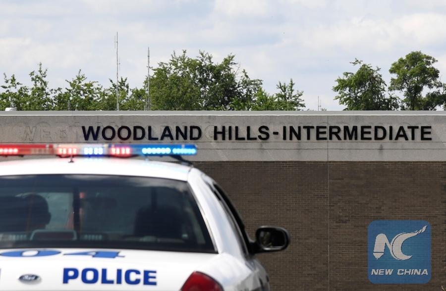 A police car is on patrol at the Woodland Hills Intermediate School in Pittsburgh, the United States, on June 25, 2018. The funeral for Antwon Rose, an African American teen shot dead by police near Pittsburgh in the state of Pennsylvania last week, was held Monday after his killing had triggered days of demonstrations against racism and police brutality. (Xinhua/Yang Chenglin)