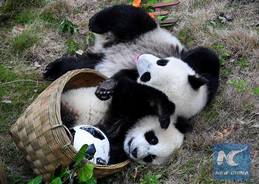 Giant pandas less than one year old take part in a football-themed party at the Shenshuping base of the Wolong giant panda protection and research center in southwest China's Sichuan Province June 10, 2018. (Xinhua/Zhang Chaoqun)