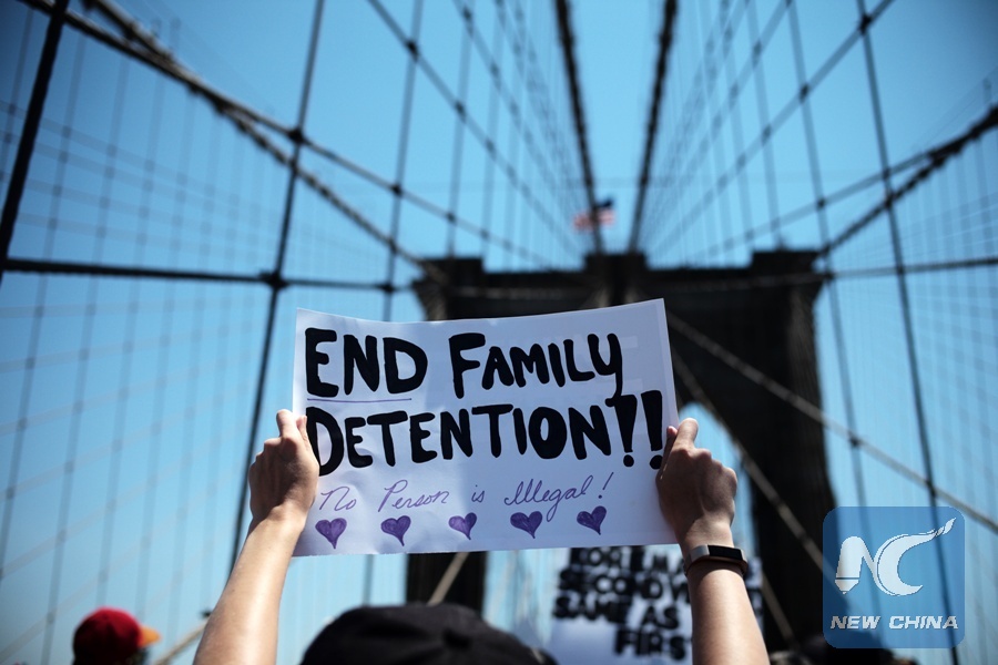 A protester attends the "Families Belong Together" rally in New York, the United States, on June 30, 2018. Tens of thousands of Americans marched and rallied across the United States to protest the Trump administration's "zero tolerance" immigration policy resulting in over 2,000 children separated from their families who crossed the border illegally. (Xinhua/Li Muzi)