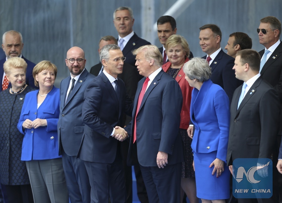 NATO Secretary General Jens Stoltenberg (center L) shakes hands with U.S. President Donald Trump during a NATO summit in Brussels, Belgium, July 11, 2018. NATO leaders gather in Brussels for a two-day meeting. (Xinhua/Ye Pingfan)