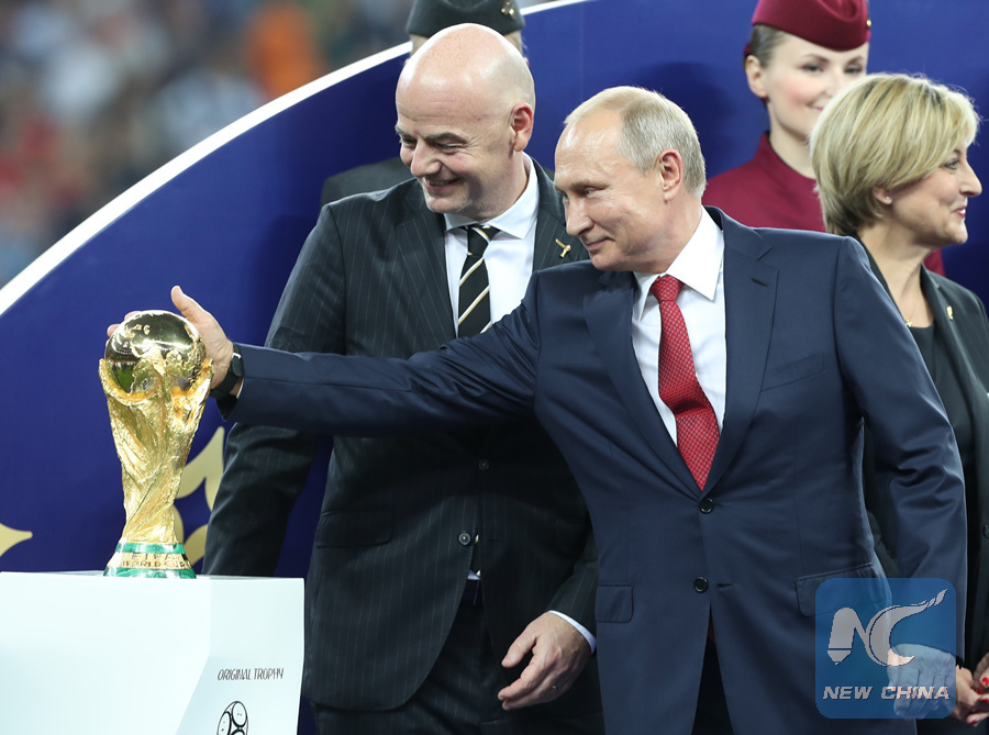 Russian President Vladimir Putin (R front) touches the World Cup trophy at the awarding ceremony after the 2018 FIFA World Cup final match between France and Croatia in Moscow, Russia, July 15, 2018. (Xinhua/Fei Maohua)