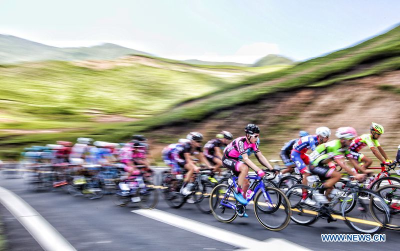 Cyclists compete in the third stage of the Tour of Qinghai Lake in northwest China's Qinghai Province, on July 24, 2018. (Xinhuanet Photo by Jia Haiyuan)