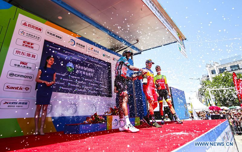Winners celebrate at the award ceremony of the third stage of the Tour of Qinghai Lake in northwest China's Qinghai Province, on July 24, 2018. (Xinhuanet Photo by Jia Haiyuan)