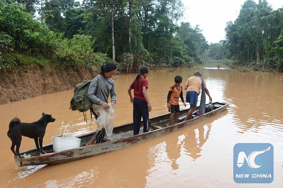 Villagers row a boat in flood after an under-construction dam collapsed in Attapeu province,Laos, on July 26, 2018. (Xinhua/Liu Ailun)