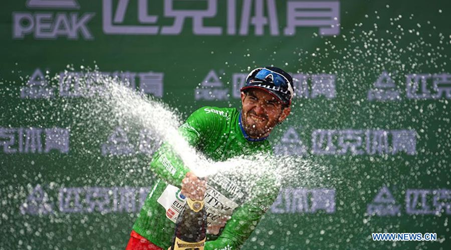 Eduard Grosu from Nippo-Vini Fantini Team (NIP) celebrates at the award ceremony of the eighth stage of the Tour of Qinghai Lake in northwest China's Gansu Province on July 29, 2018. (Xinhuanet Photo by Yang Shoude)??