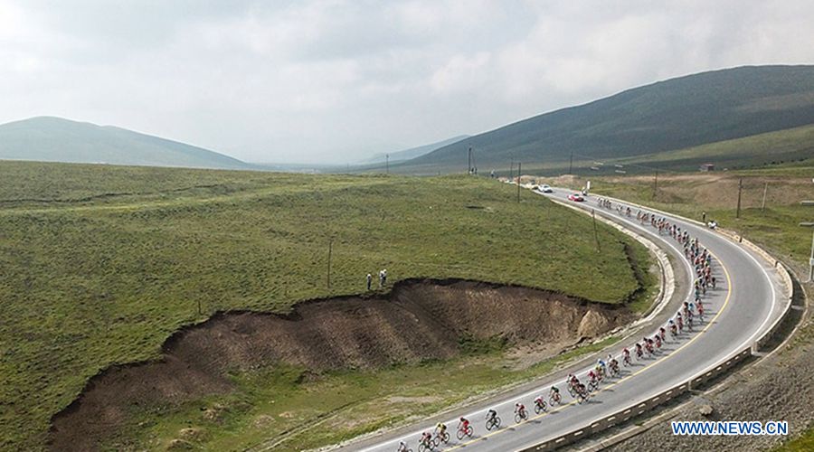 Cyclists compete in the eighth stage of the Tour of Qinghai Lake in northwest China's Qinghai Province on July 29, 2018. (Xinhuanet UAV Photo)