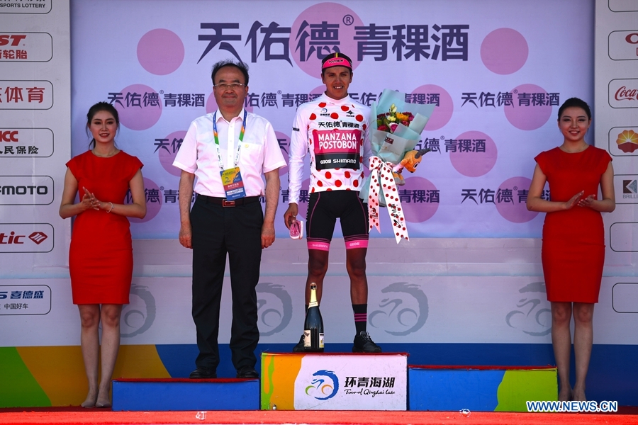 Hernan Aguirre from Manzana Postobon?celebrates with polka-dot mountains jersey at the award ceremony of the tenth stage of the Tour of Qinghai Lake in northwest China's Gansu Province, on August 1, 2018.(Xinhuanet Photo by Yang Shoude)