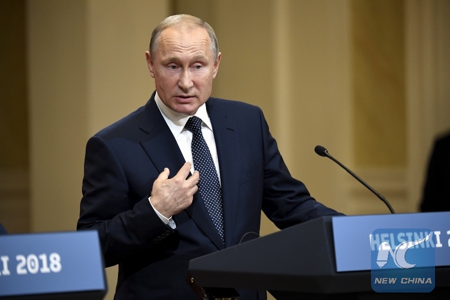 Russian President Vladimir Putin speaks during a joint press conference with U.S. President Donald Trump (not in the picture) in Helsinki, Finland, on July 16, 2018. Donald Trump and Vladimir Putin started their first bilateral meeting here on Monday. (Xinhua/Lehtikuva/Antti Aimo-Koivisto)