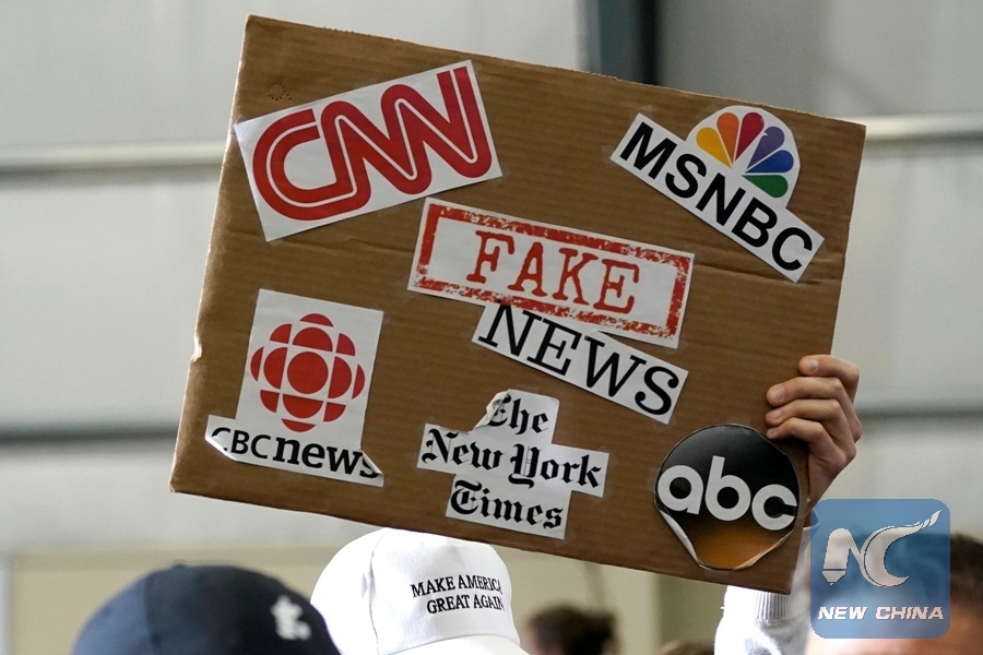 A sign showing major news organizations along with the words "fake news" is held up as U.S. President Donald Trump speaks at a Make America Great Again Rally in Washington, Michigan April 28, 2018. (Xinhua/REUTERS)