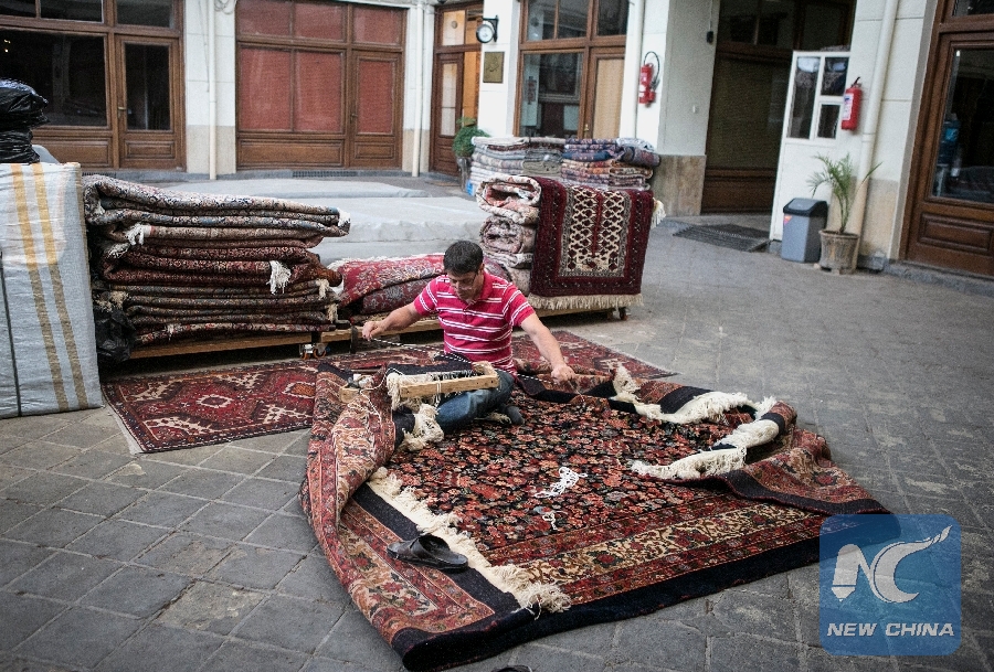 File Photo: A man works on a handwoven carpet at a bazaar in downtown Tehran, Iran, on July 30, 2018. Iran will file a lawsuit with international tribunals against U.S. fresh sanctions on importing handwoven Iranian rugs, Press TV reported on July 28. (Xinhua/Ahmad Halabisaz)