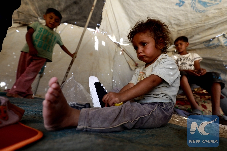 Syrian children, displaced from their homes in Deir Ezzor, dress in new clothes received as part of humanitarian aid provided by the United Nations Children's Fund (UNICEF) at their camp in the eastern Syrian city of Hasakeh on Aug. 16, 2018. (Xinhua/AFP)
