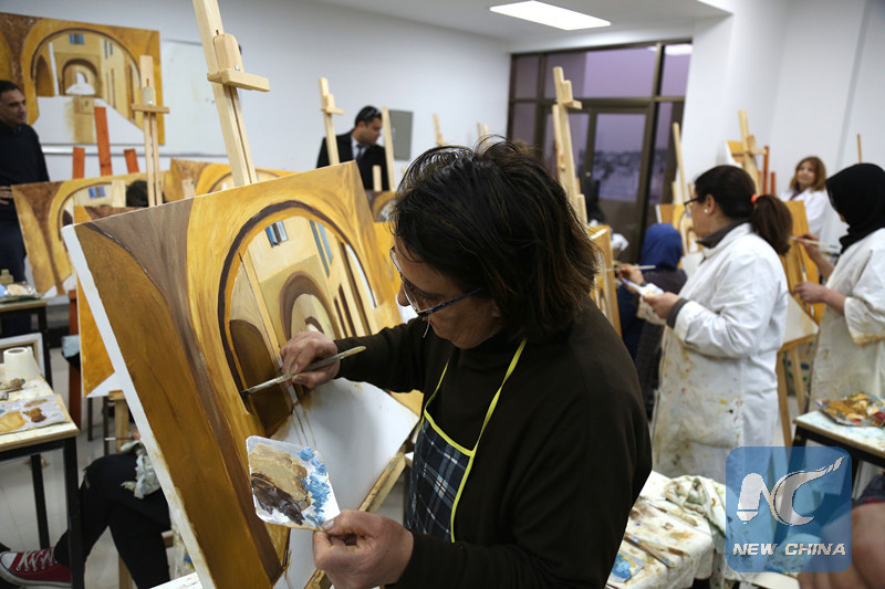 People are learning painting in China-built El Menzah Youth Sports Culture Center in Tunis, Tunisia. (Xinhua/LiuKai)