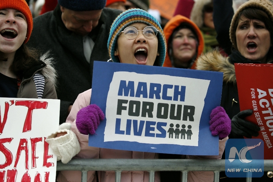 File Photo: People take part in the "March for Our Lives" rally in Chicago, the United States, on March 24, 2018. Tens of thousands of people gathered at Union Park in Chicago for the "March for Our Lives" gun control rally, demanding the end of gun violence and mass school shootings. (Xinhua/Wang Ping)