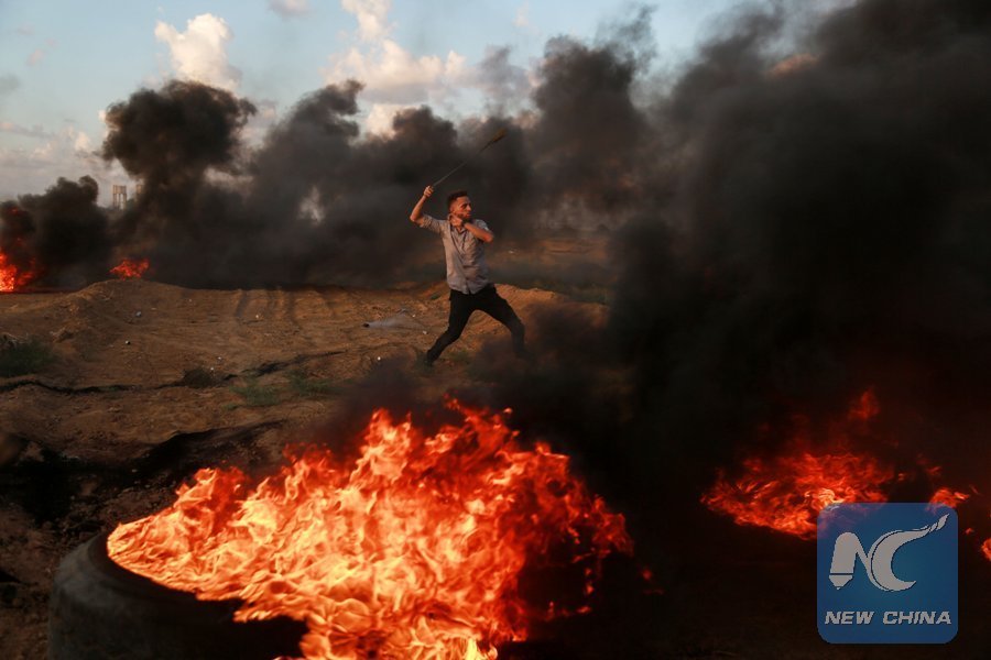 File Photo: A Palestinian protester uses a slingshot to hurl stones at Israeli troops during clashes on the Gaza-Israel border, east of Gaza City, on Sept. 7, 2018. (Xinhua/Stringer)