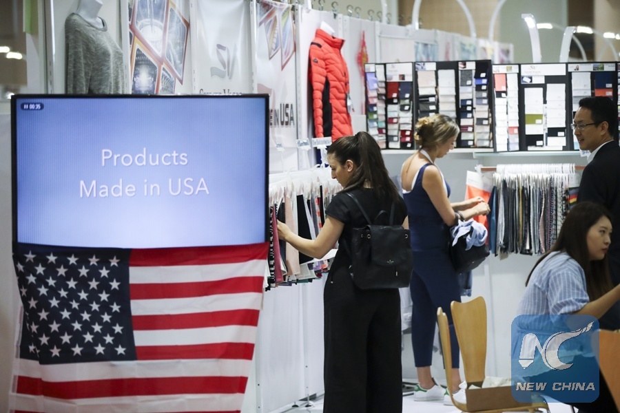Buyers look at exhibits of a U.S. producer at the Chinese Textile and Apparel Trade Show in New York, the United States, July 23, 2018. (Xinhua/Wang Ying)