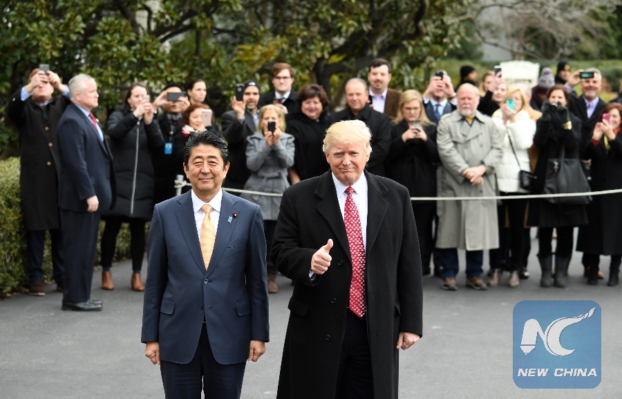 File Photo: U.S. President Donald Trump (R) and Japanese Prime Minister Shinzo Abe pose for a photograph as they walk to board Marine One departing for Andrews Air Force Base en route to West Palm Beach, Florida, after their joint press conference at the White House in Washington D.C., the United States, on Feb. 10, 2017. (Xinhua/Yin Bogu)