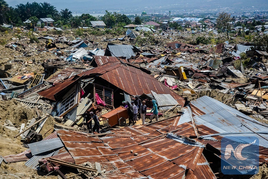 Photo taken on Oct. 2, 2018 shows debris of houses in Balaroa village after earthquake and tsunami in Palu, Central Sulawesi, Indonesia. (Xinhua/Iqbal Lubis)