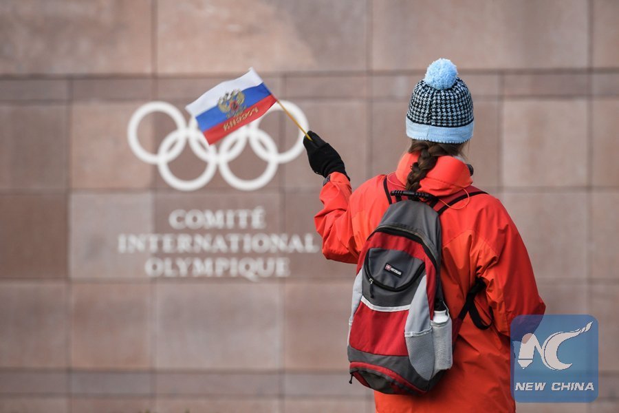 File Photo: A supporter waves a Russian flag in front of the logo of the International Olympic Committee (IOC) at their headquarters on Dec. 5, 2017 in Pully near Lausanne. The International Olympic Committee opened a high-stakes summit on Dec. 5 on whether to bar Russia from the Winter Olympics over allegations its medal haul at the 2014 Sochi Games was fuelled by state-sponsored doping. (Xinhua/AFP)