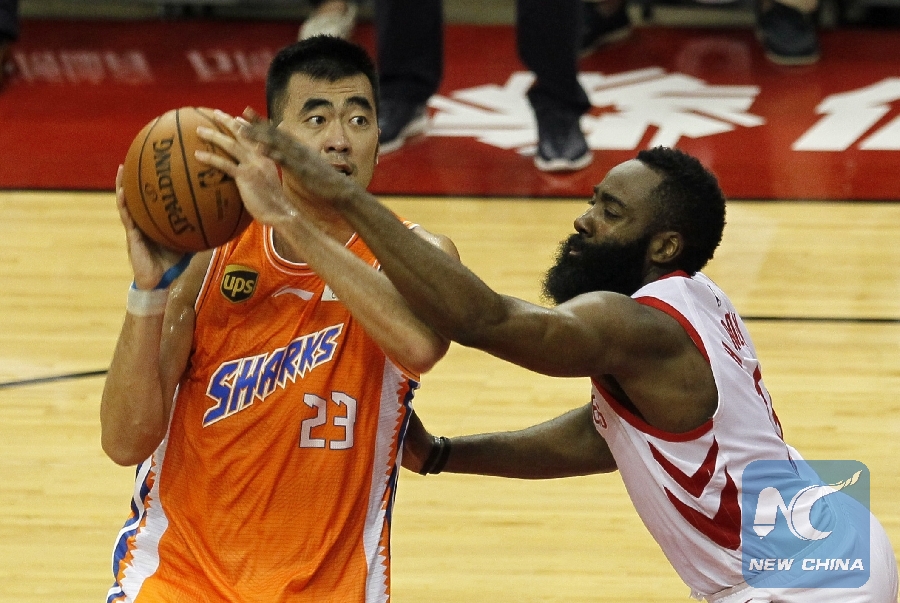 Houston Rockets' superstar James Harden guards Shanghai Sharks' Zhang Zhaoxu in the game on October 9, 2018 (Xinhua/Song Qiong)