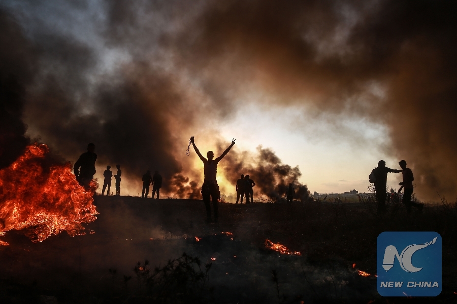 Palestinian protesters clash with Israeli troops on the Gaza-Israel border, east of Gaza City, on Oct. 12, 2018. At least 7 Palestinians were killed and 252 others were injured on Friday by Israeli soldiers during clashes along the Gaza Strip's borders with Israel, medics said. (Xinhua/Stringer)