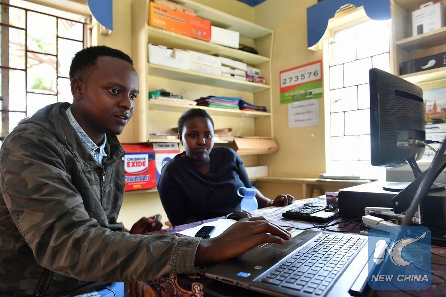 A customer (L) downloads documents on line with the help of a working staff at a cyber cafe in Nairobi, Kenya, Nov. 18, 2016.(Xinhua/Sun Ruibo)