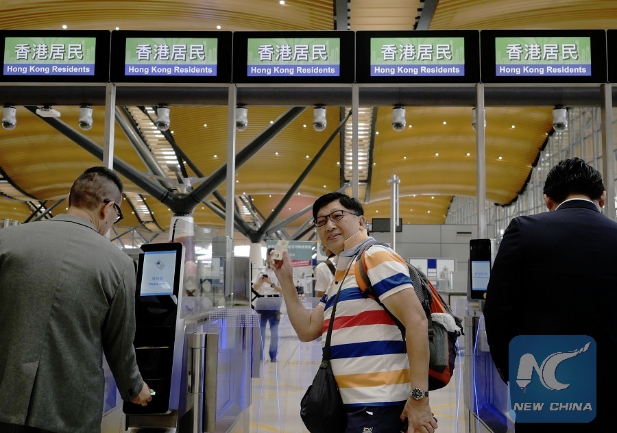 Passengers pass through the automatic channel in Hong Kong port of the Hong Kong-Zhuhai-Macao Bridge, in Hong Kong, south China, Oct. 24, 2018. (Xinhua/Wang Shen)