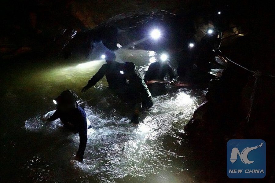 Royal Thai Navy SEALs take part in rescue operation for 12 Thai teenagers and their football coach in northern Thailand's Chiang Rai Province, June 30, 2018. (Xinhua)