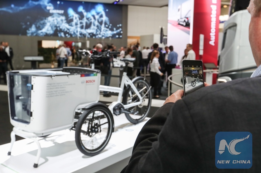 A visitor takes photos of an eBike at the booth of Bosch during the IAA Commercial Vehicles in Hanover, Germany, on Sept. 20, 2018. (Xinhua/Shan Yuqi)
