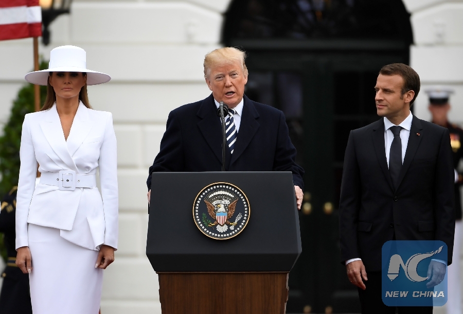 File Photo: U.S. President Donald Trump (C) speaks during a state arrival ceremony welcoming French President Emmanuel Macron (R) at the White House in Washington D.C., the United States, April 24, 2018. (Xinhua/Yang Chenglin)