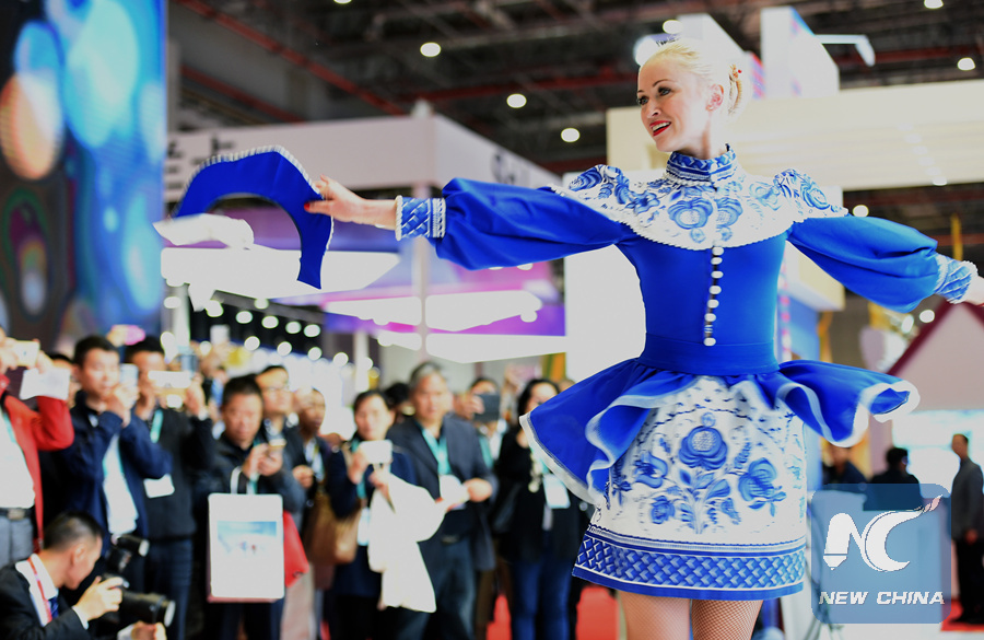 A performer dances at the booth of Russia at the first China International Import Expo (CIIE) in Shanghai, east China, Nov. 8, 2018. (Xinhua/Han Yuqing)