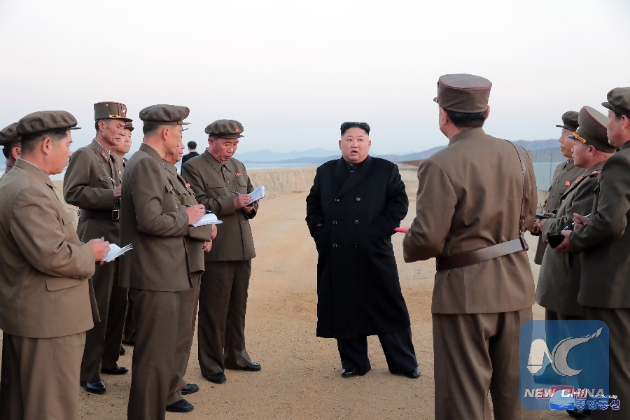 Photo provided by the Korean Central News Agency (KCNA) on Nov. 16, 2018 shows Kim Jong Un (C), top leader of the Democratic People's Republic of Korea (DPRK), supervises the test of a newly developed ultramodern tactical weapon. (Xinhua/KCNA)